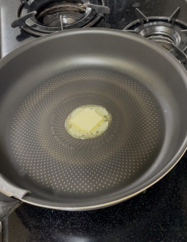 トッピングの準備が終わったら、バターをフライパンに乗せて弱火で熱します🔥♡