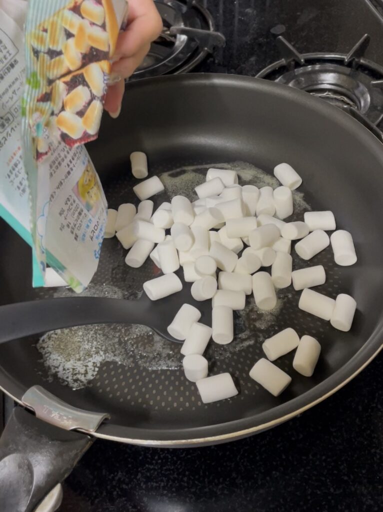 バターをフライパン全体に広げたら、マシュマロを投入!