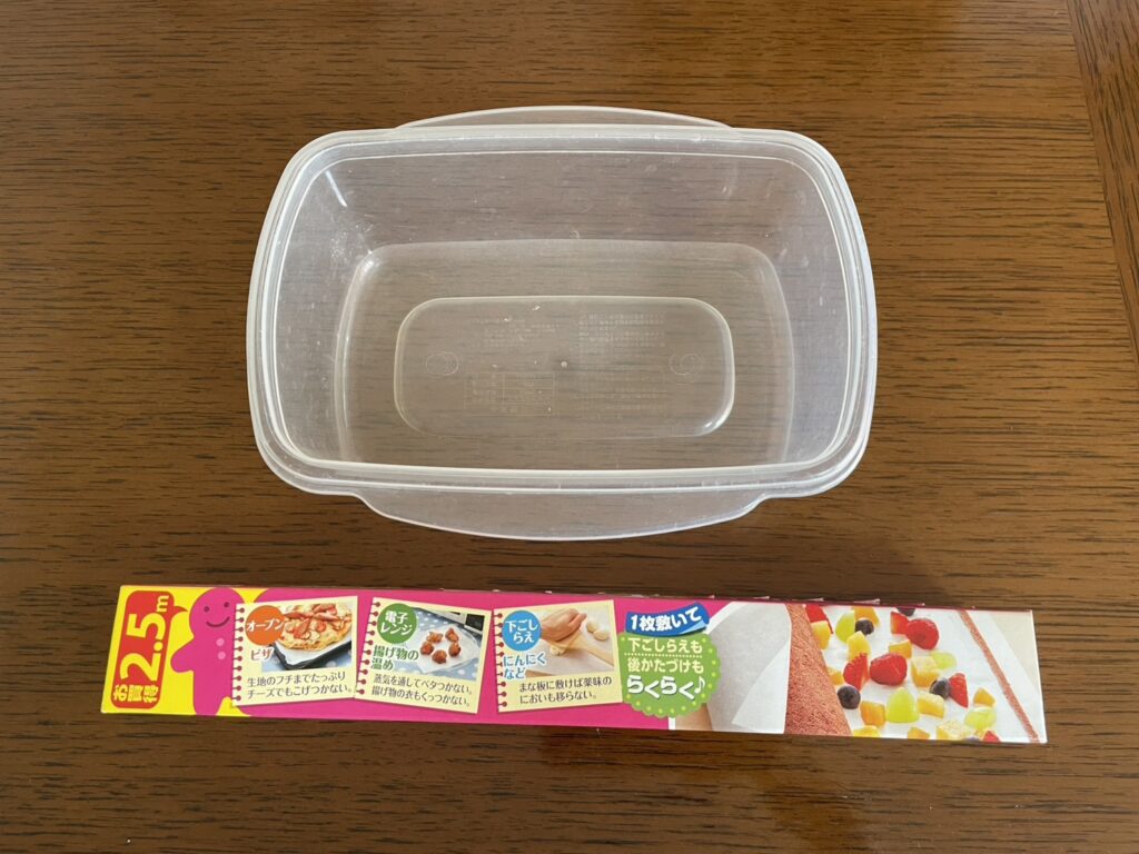 タッパーとクッキングシートは、マシュマロヌガーを成型する時に使うよ👍。