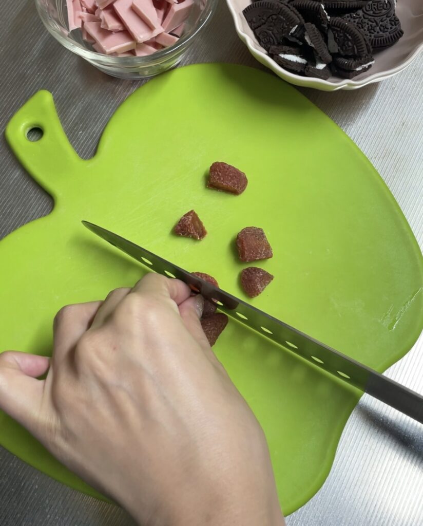 ドライストロベリーは、ゴロっと食感が残るくらいの大きさにカット!🔪