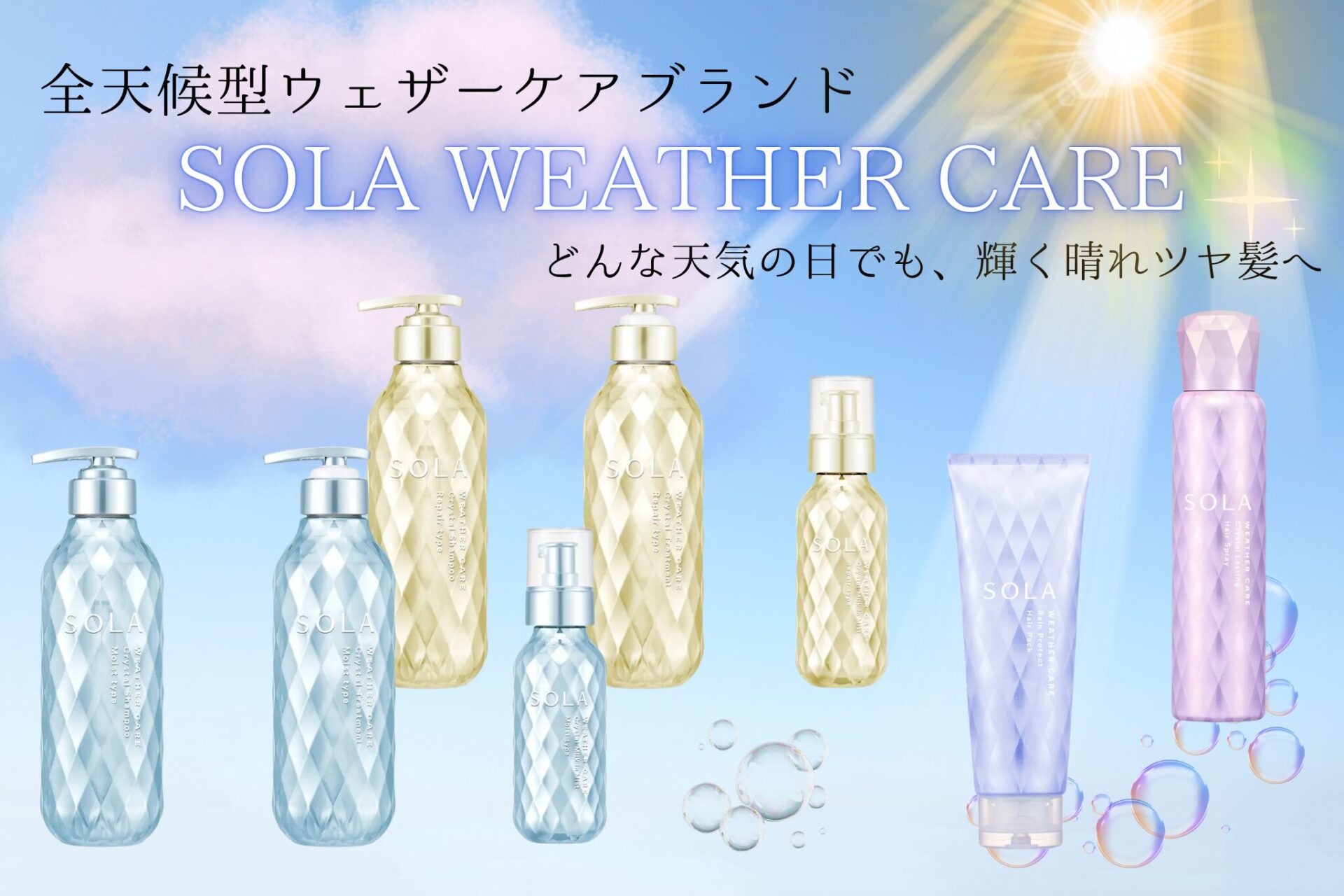 「SOLA WEATHER CARE Crystal Moist type (ソラ ウェザーケア クリスタル モイストタイプ)」と、「SOLA WEATHER CARE Crystal Repair type (ソラ ウェザーケア クリスタル リペアタイプ)」の2つのラインから、自分の髪質に合わせて選んでみてね!🌟