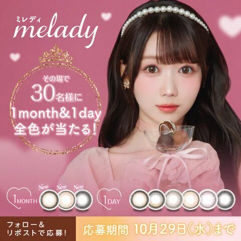 2025年10月23日(木)より、melady公式Xアカウントにて抽選で30名様にmeladyマンスリー&ワンデー全色セットが当たるプレゼントキャンペーンが実施されるみたい!✨