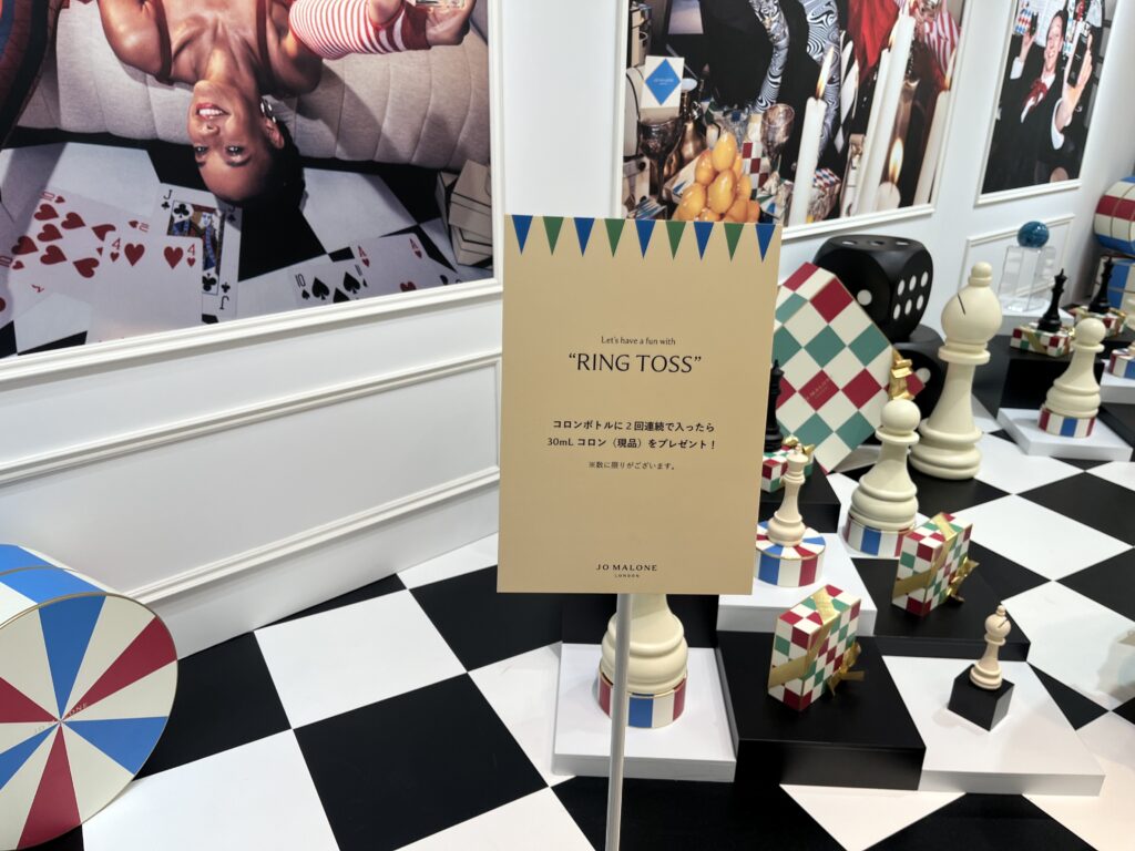 写真奥にあるJO MALONE LONDONのコロンのディスプレイを狙って輪を投げるゲーム🎯。