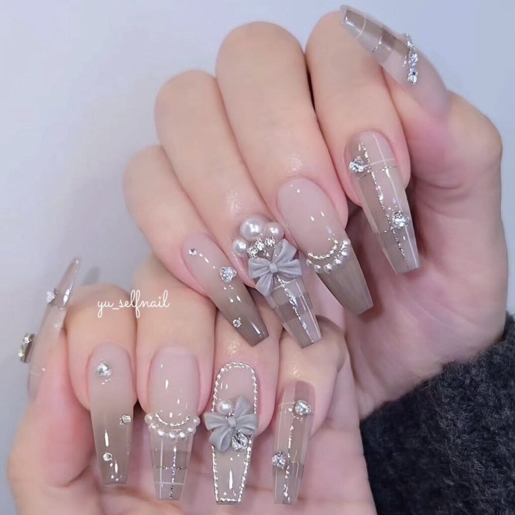 落ち着いたグレージュにリボンを合わせれば、上品さと可愛さを両立した大人ネイルに。🎀