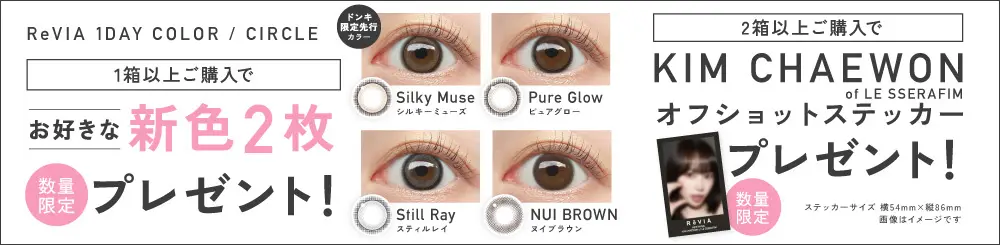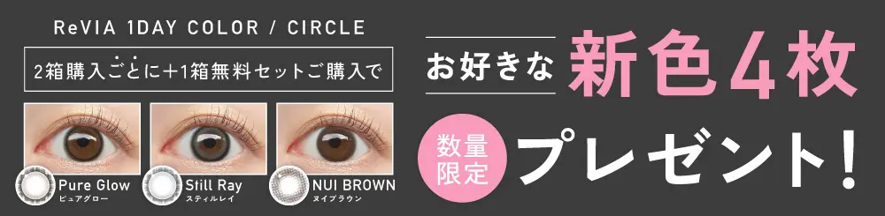 ReVIA 1day「2箱購入+1箱無料セット」1セットご購入ごとに、お好きな新色(1枚入り)×4枚をプレゼント!