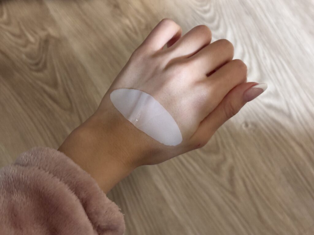 3~8時間貼ることで、美容液がお肌に吸収され、シートの色が乳白色から透明に変化したら完了!(画像は6時間経過後)