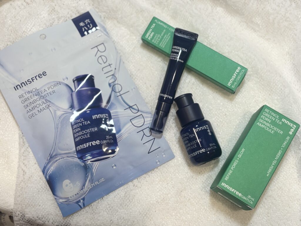 今回は、イニスフリーの人気ライン「レチノール×PDRN」の美容液とマスク、そして新発売となる「グリーンティーPDRN バウンズ アイ&スポットセラム」を合わせた3点をご紹介しました!