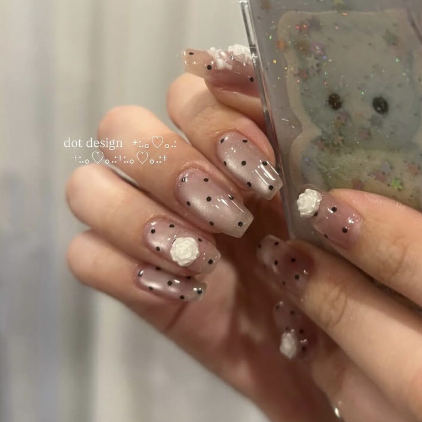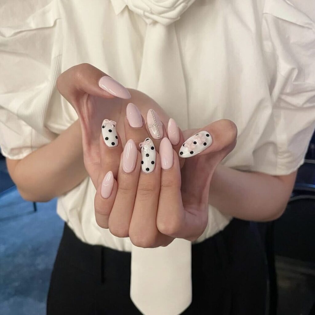 淡いピンクに、小さなホワイトドットをのせれば甘い仕上がりに。🍬🤍