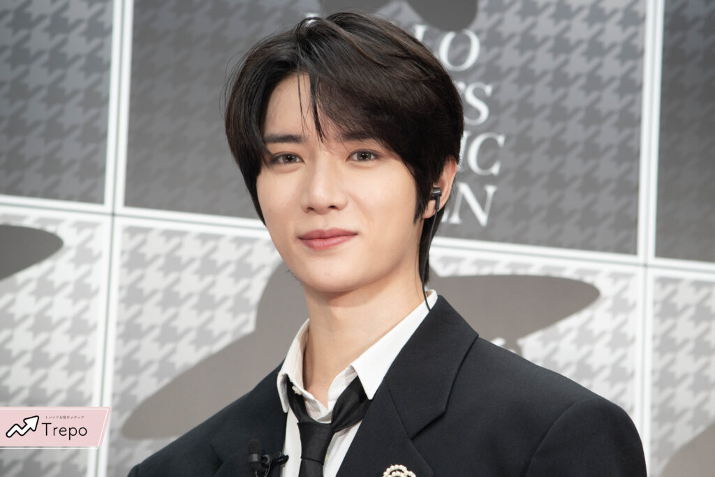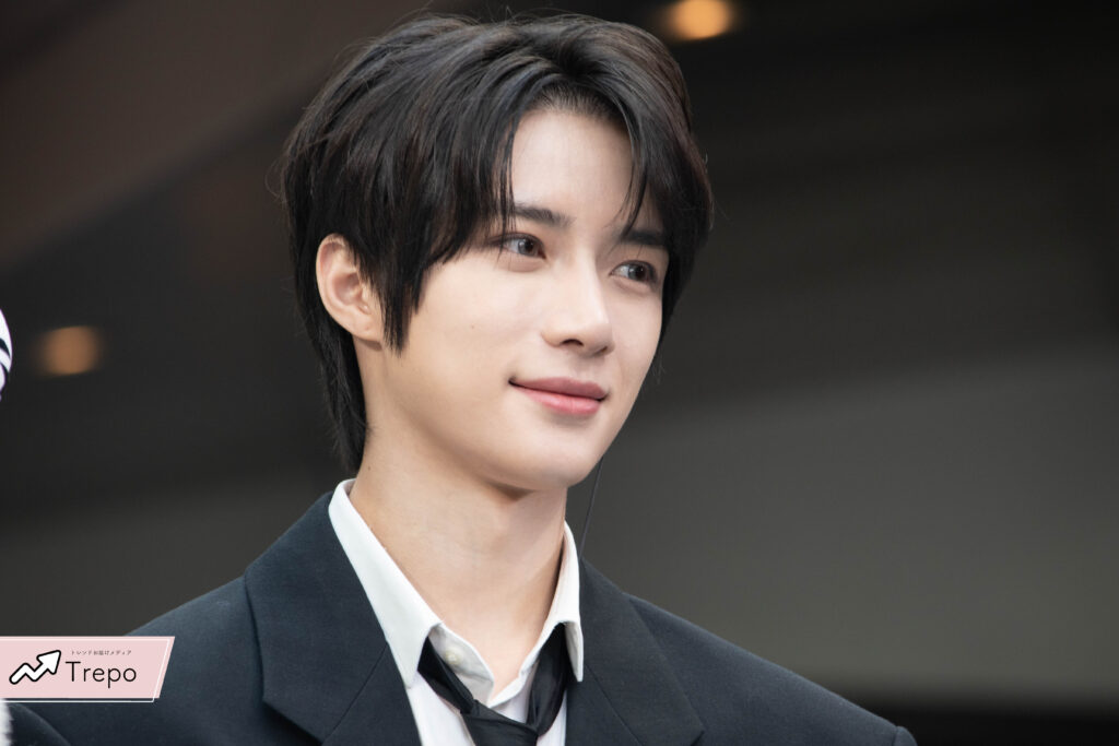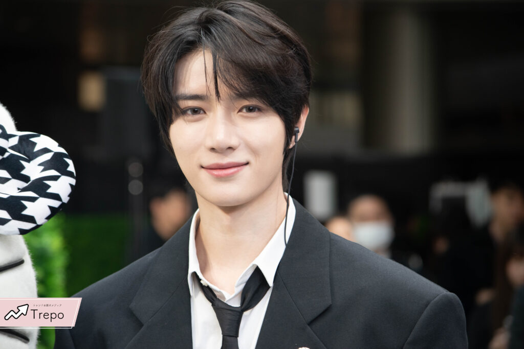 真っ黒なスーツで白い肌が生えるスタイリングで登場したボムギュさん。🖤