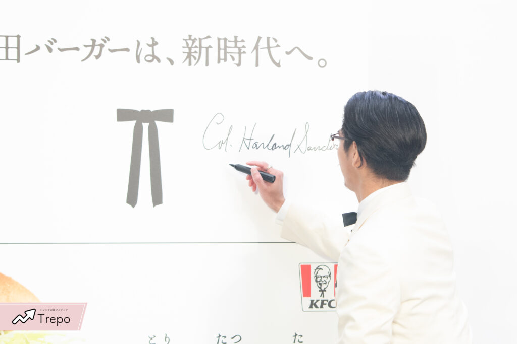 カーネル・サンダースのサインの下に賀来さんもサインを書くということで、ペンが渡されると…
