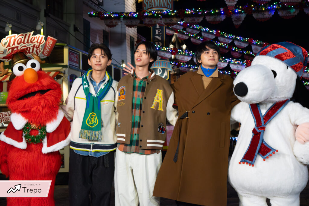 クリスマスマーケットのチュロスを手に、エルモとクッキーモンスターと一緒に北村さん、そして同事務所のダンスボーカルユニット「ICE(アイス)」の阿久根 温世さん、竹野 世梛さんがそろって登場!🧸🪄