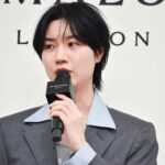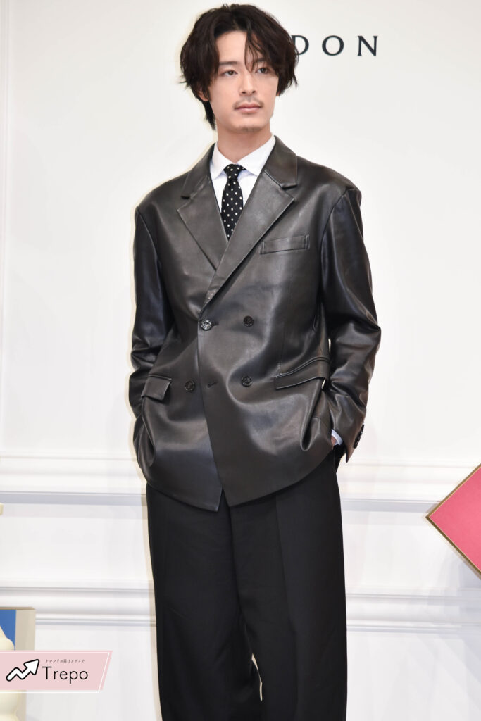 塩野瑛久さんは、ドット柄のネクタイをアクセントにしたモノトーンコーデで登壇。