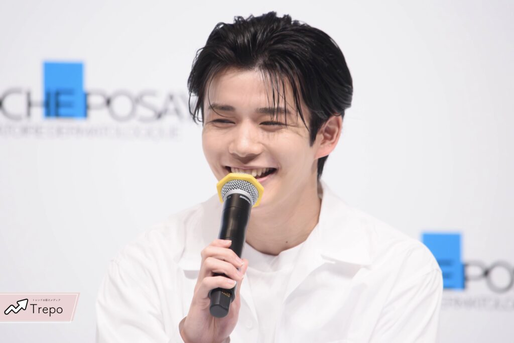 新商品のカラーに合わせた、ホワイトの衣装で登場した長尾謙杜さん。