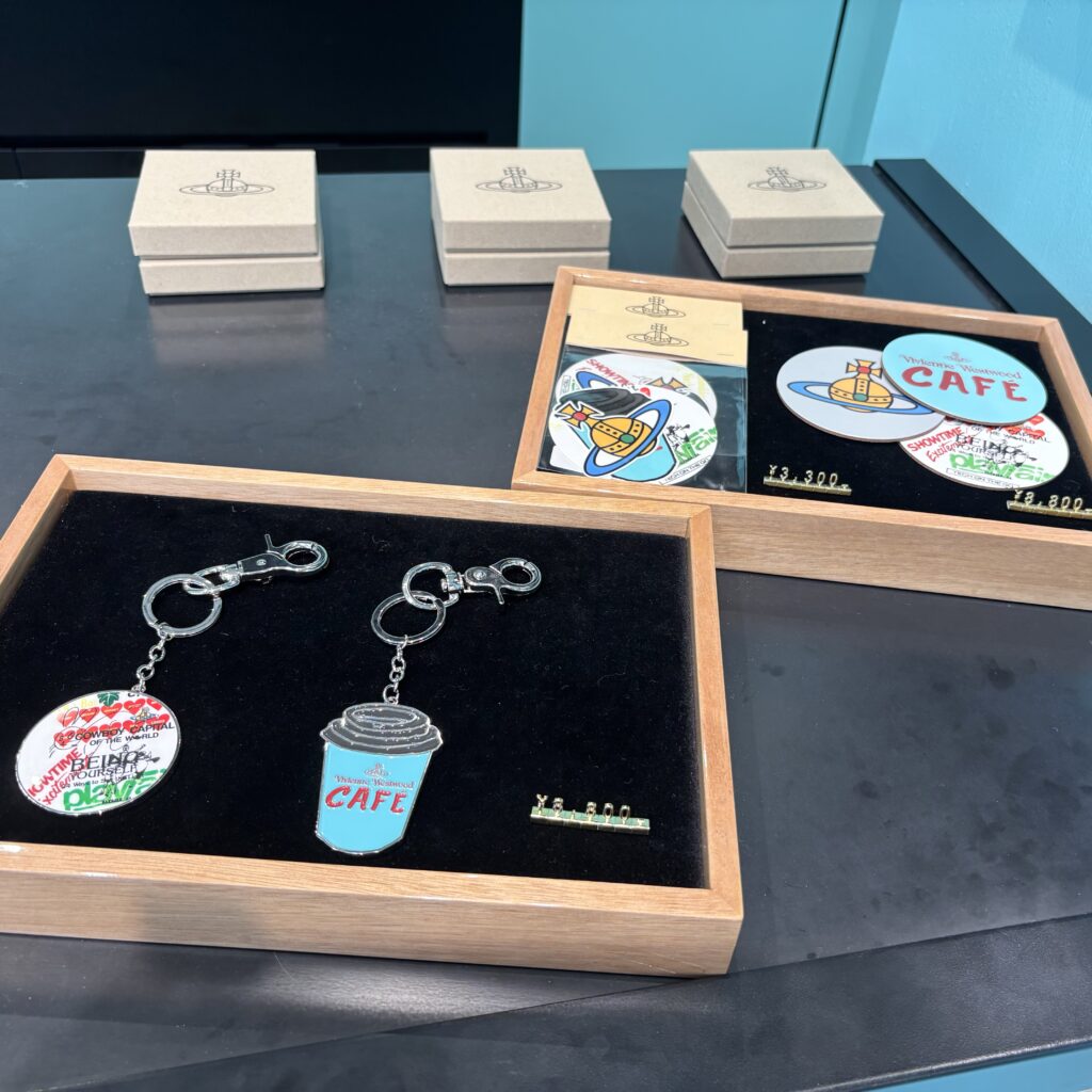 キーホルダー(8,800円)やステッカー(3,300円)、コースター(8,800円)など、ヴィヴィアンらしいデザインの限定グッズが販売されているよ!