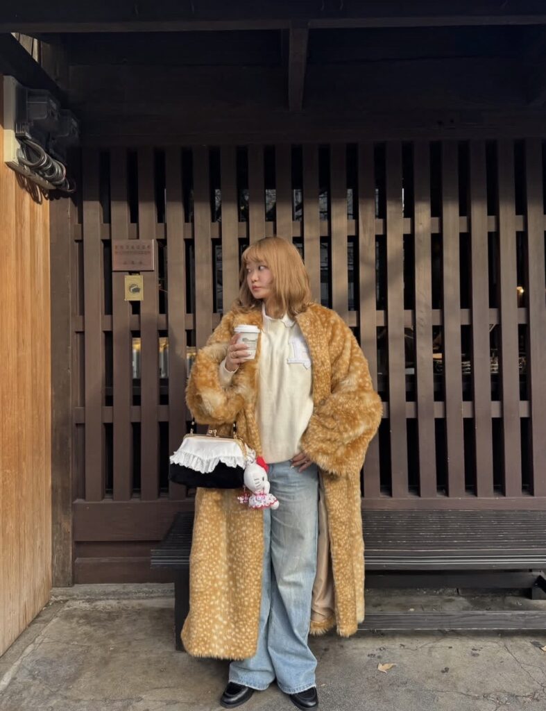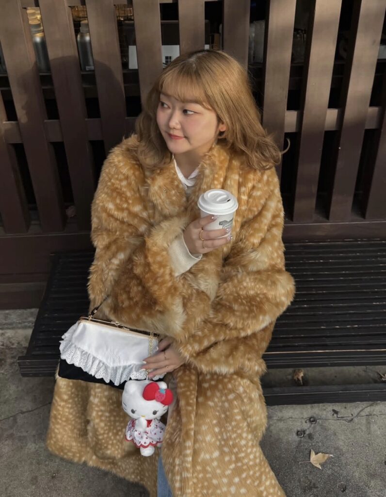 ボリュームのあるバンビ柄のファーコートは、寒い季節にぴったり♡
