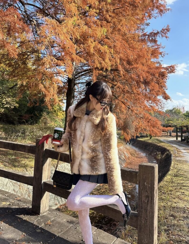 白のレースタイツ×黒のパンプスというクラシックガーリーなコーデに、バンビ柄のファーコートを合わせたバンビコアコーデ🦌♡