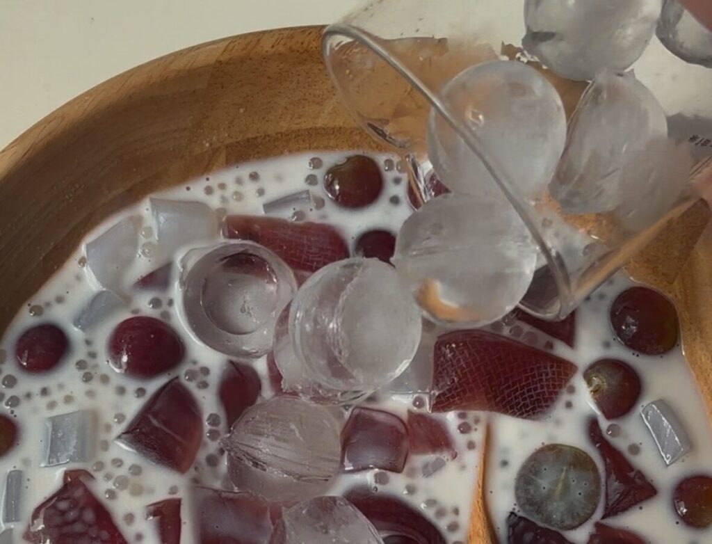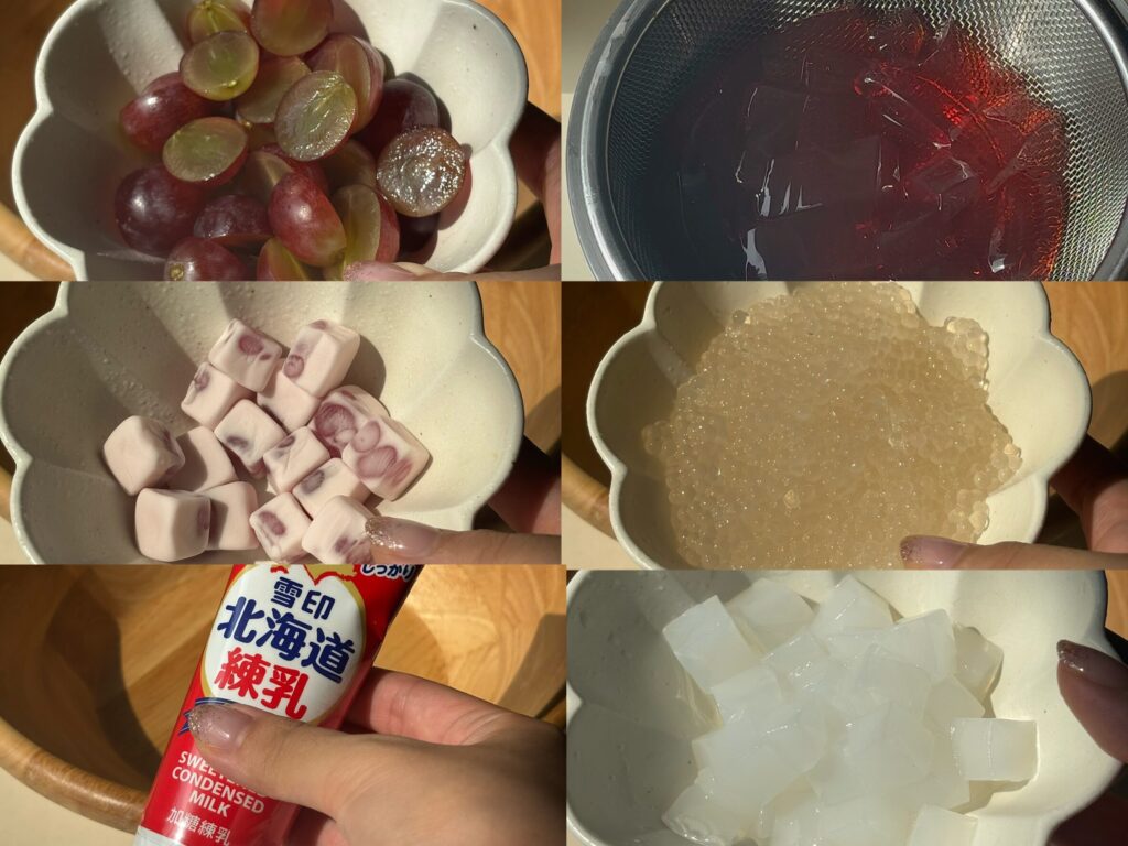 ③ナタデココ、グミ、白玉など独特の食感を持つ食材を入れると楽しいよ♪