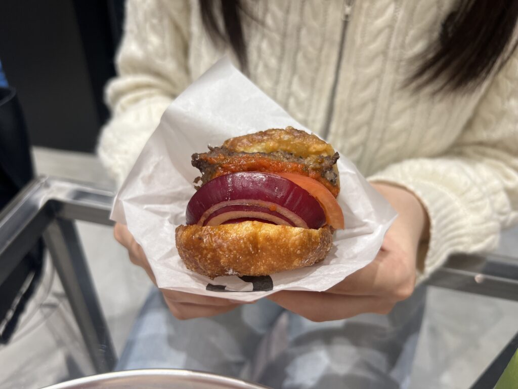 菓子生地のバンズに、牛肉のパテ・ポマローラソース・トマト・赤玉ねぎが入ったドーナツ。