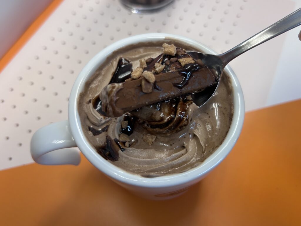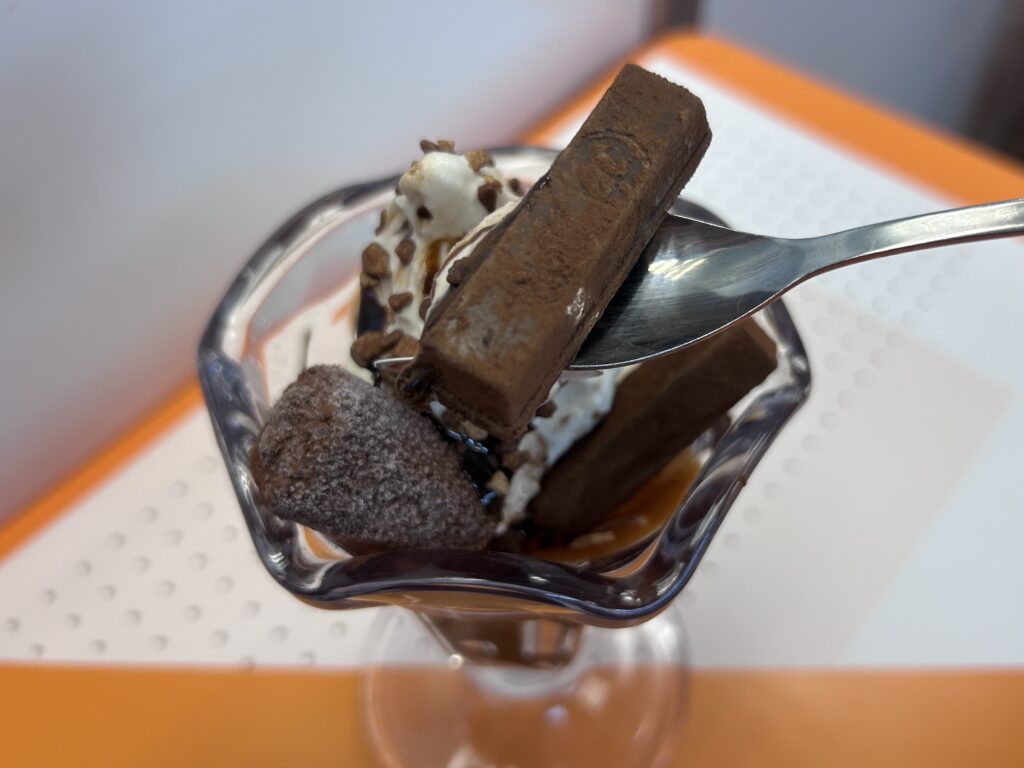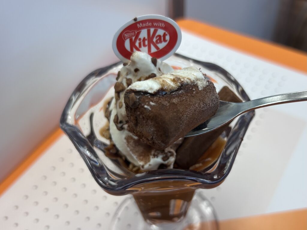 ベルギーチョコホイップ、生チョコアイス、チョコソース、そしてサクサクの「キットカット」が層を織りなします。