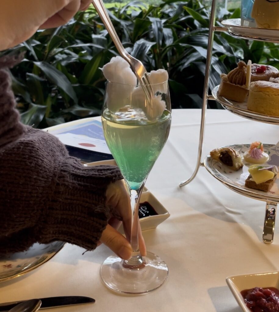 上に乗っている綿菓子をドリンクに沈めてからいただくよ♪