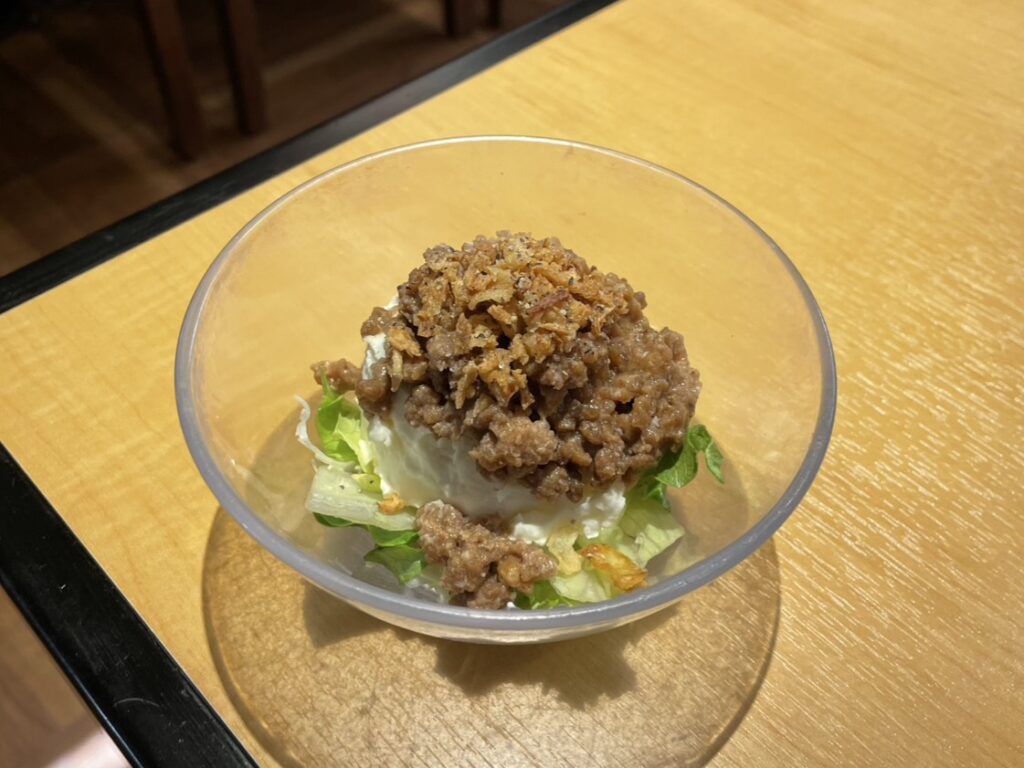シンプルなポテトサラダに甘辛だれで味付けしたひき肉を乗せたオリジナルのサラダだよ✨。
