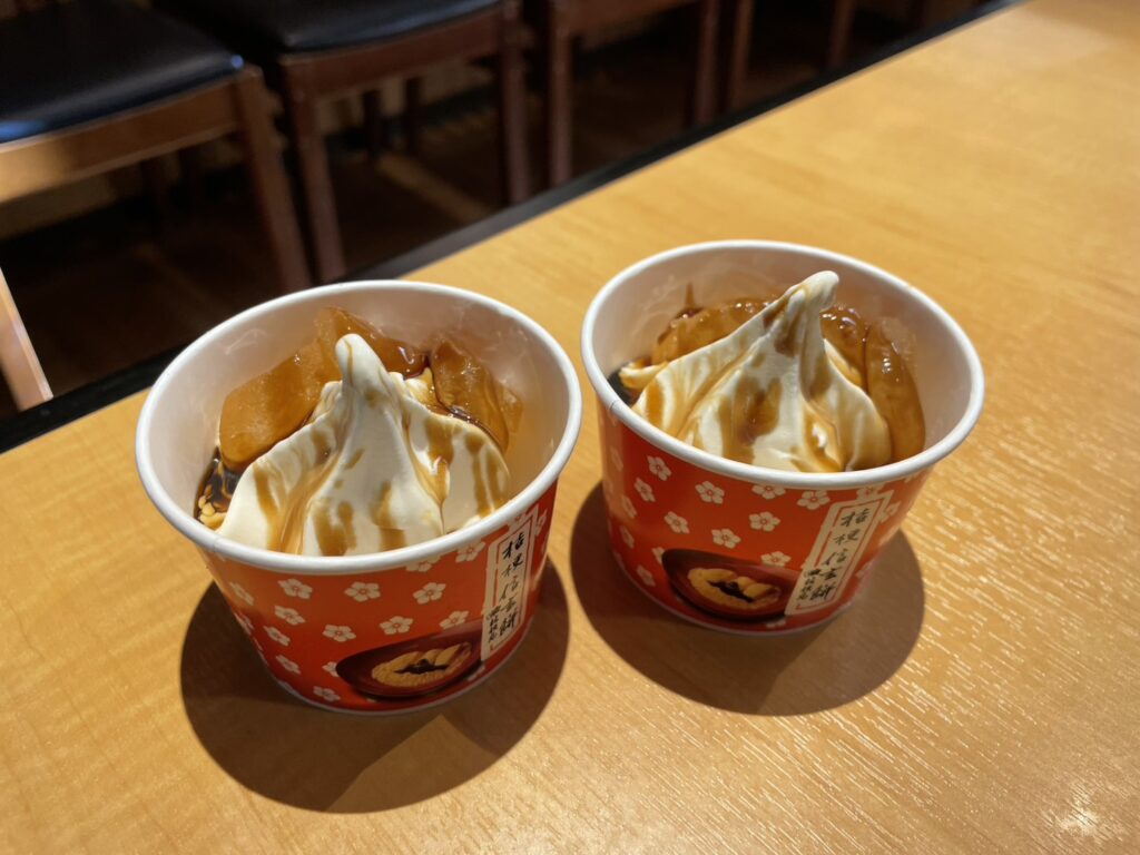 冷たいソフトクリームと、お餅・きな粉・黒蜜の相性が抜群💕。