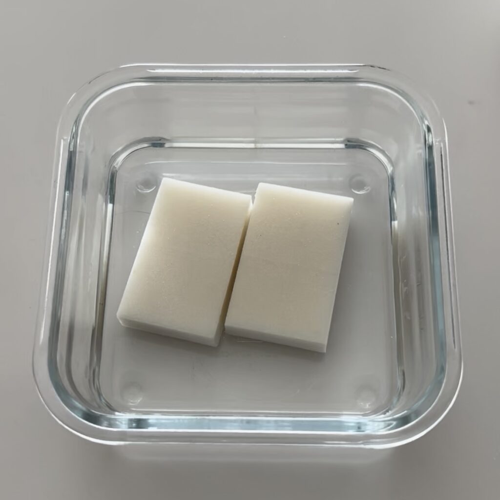 切り餅を耐熱皿にのせて、電子レンジでやわらかくなるまで温めます。