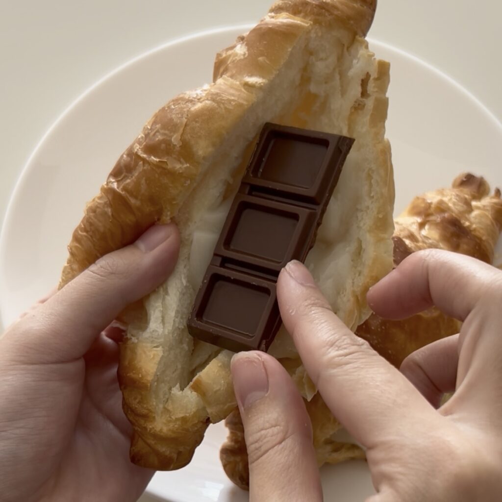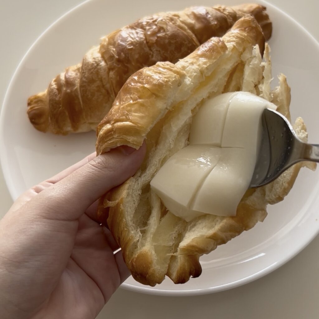 温めたお餅を、切り込みを入れたクロワッサンにイン!