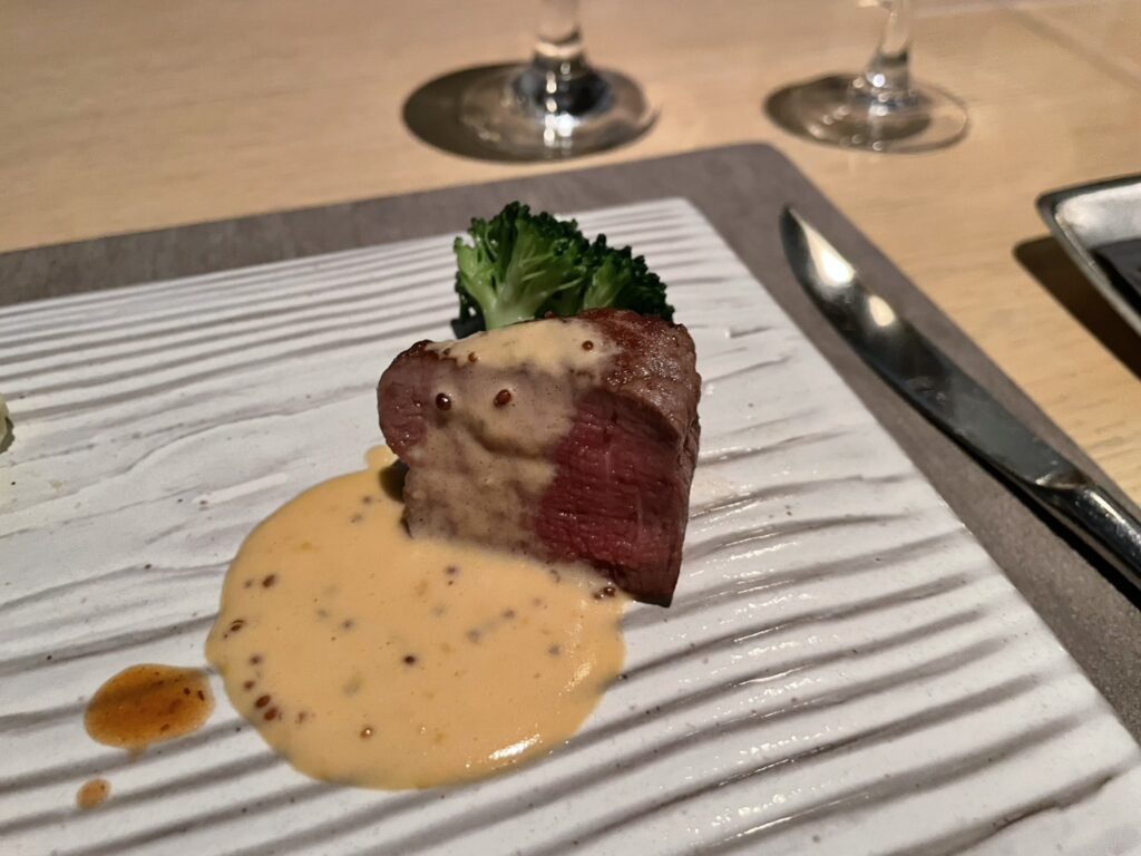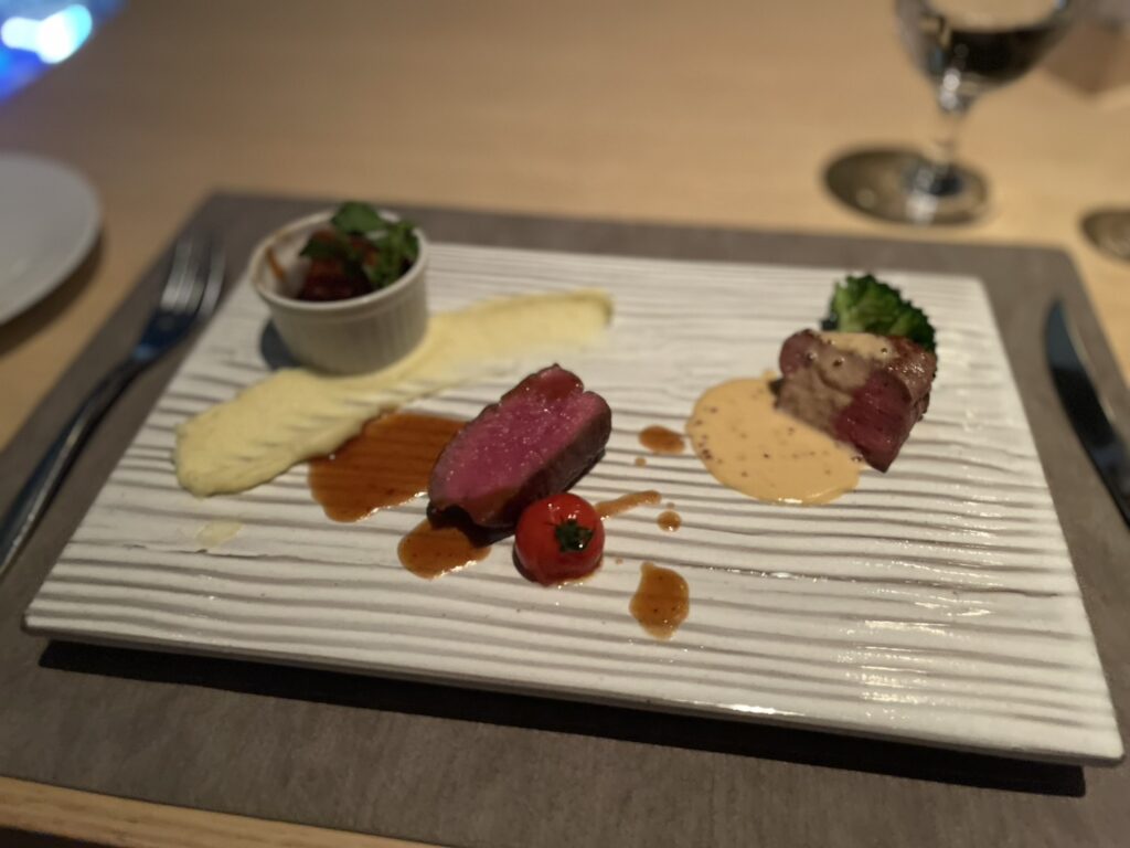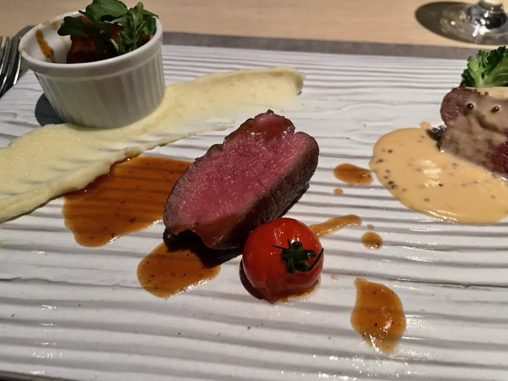 メイン料理は寒い時期に嬉しい、「東京の銘柄豚TOKYO Xの赤ワイン煮 仔牛フィレロースト、牛フィレ肉のポワレ」💕