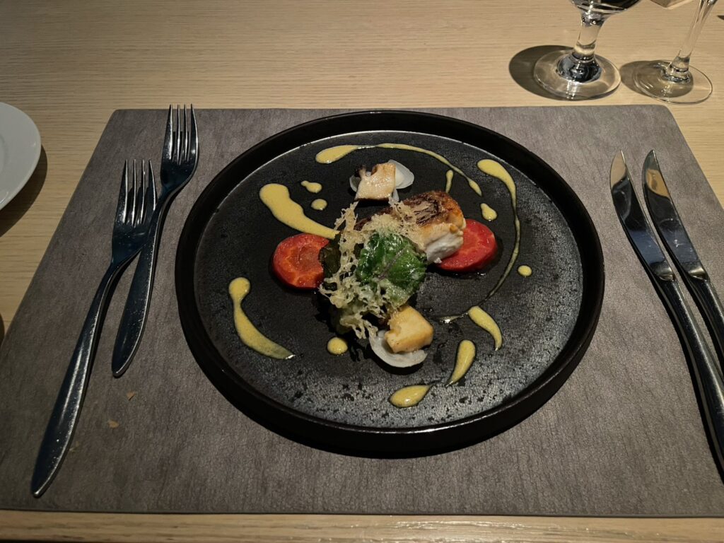 続いては「鯛のポワレと鮑のバターソテー プチベールのフリットを添え サフランソース」🐟✨。