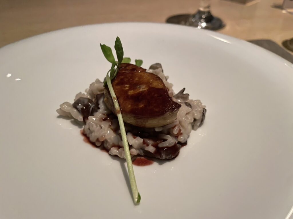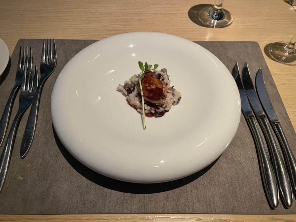 「フォアグラのポワレ 東京産きの子のリゾットとともに」は、東京産のきの子を使ったリゾットの上にフォアグラのポワレが乗った一品🍽️。