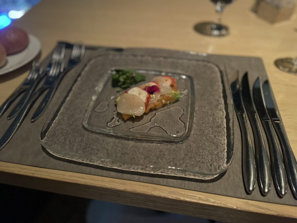 アボカドとサーモンのタルタルの上に、マリネした帆立とオマール海老のスライスが乗っています🪄。