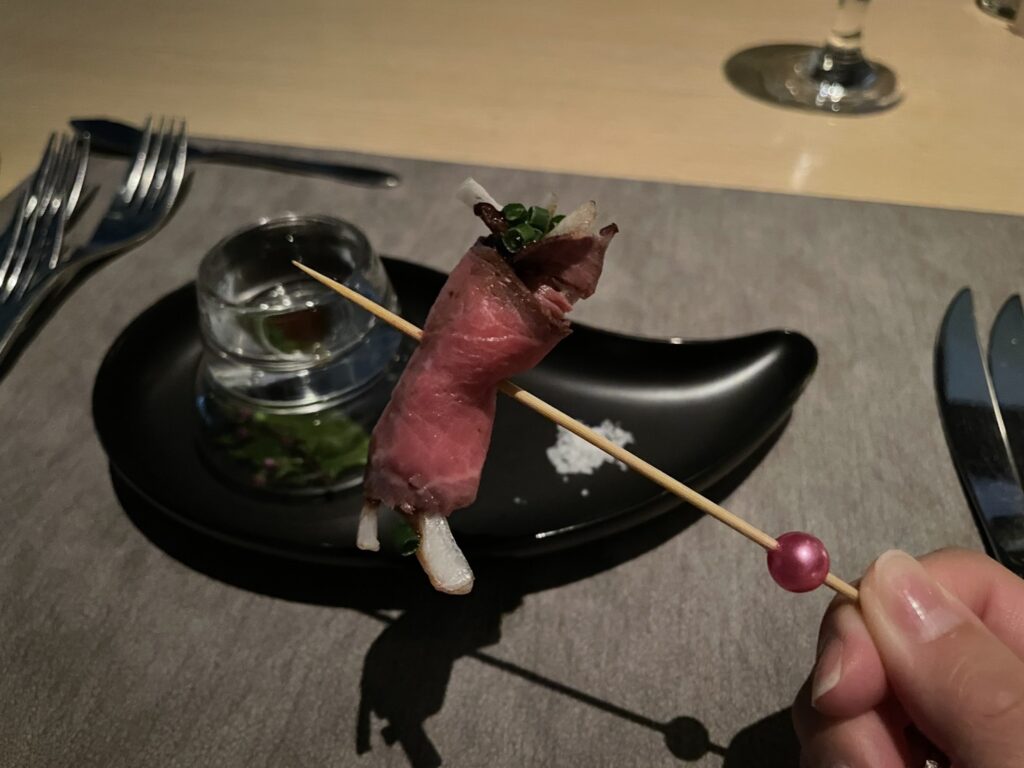 まずはアミューズの「牛肉タタキのピンチョスと淡路玉ねぎのスライス」♡