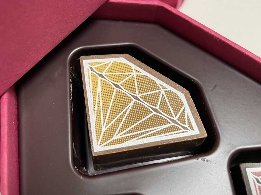 ペルートンカダイヤモンドは、ダークチョコレート×カカオ&トンカ豆フレーバーのガナッシュの味わいが楽しめるよ🍫。