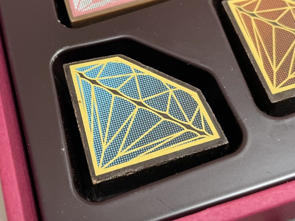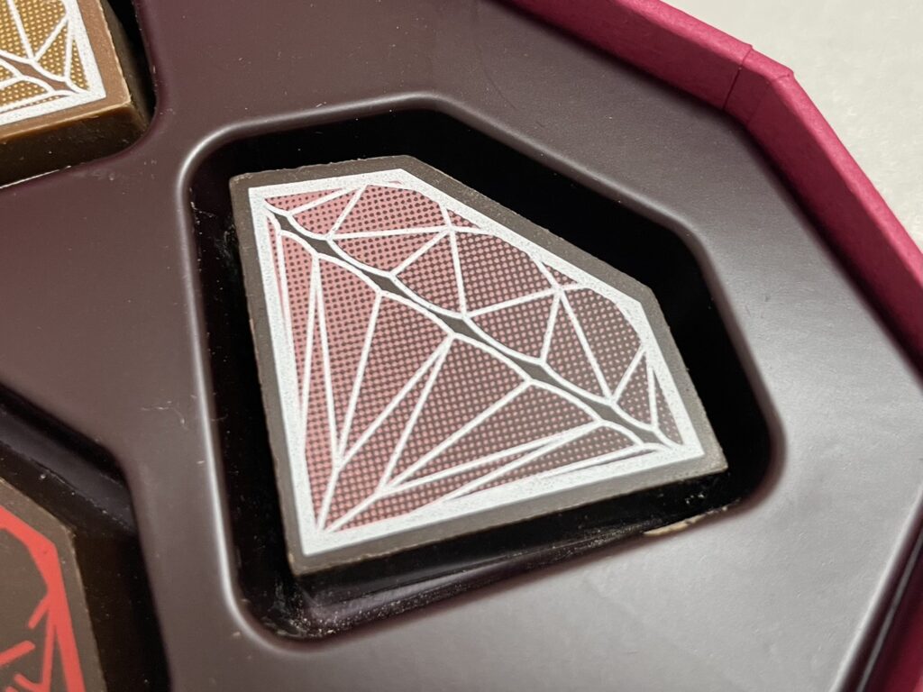 ライチダイヤモンドは、ダークチョコレートの中に柔らかな風味のライチガナッシュが入っているよ💎。