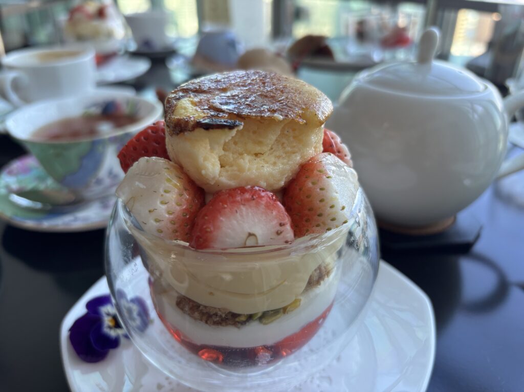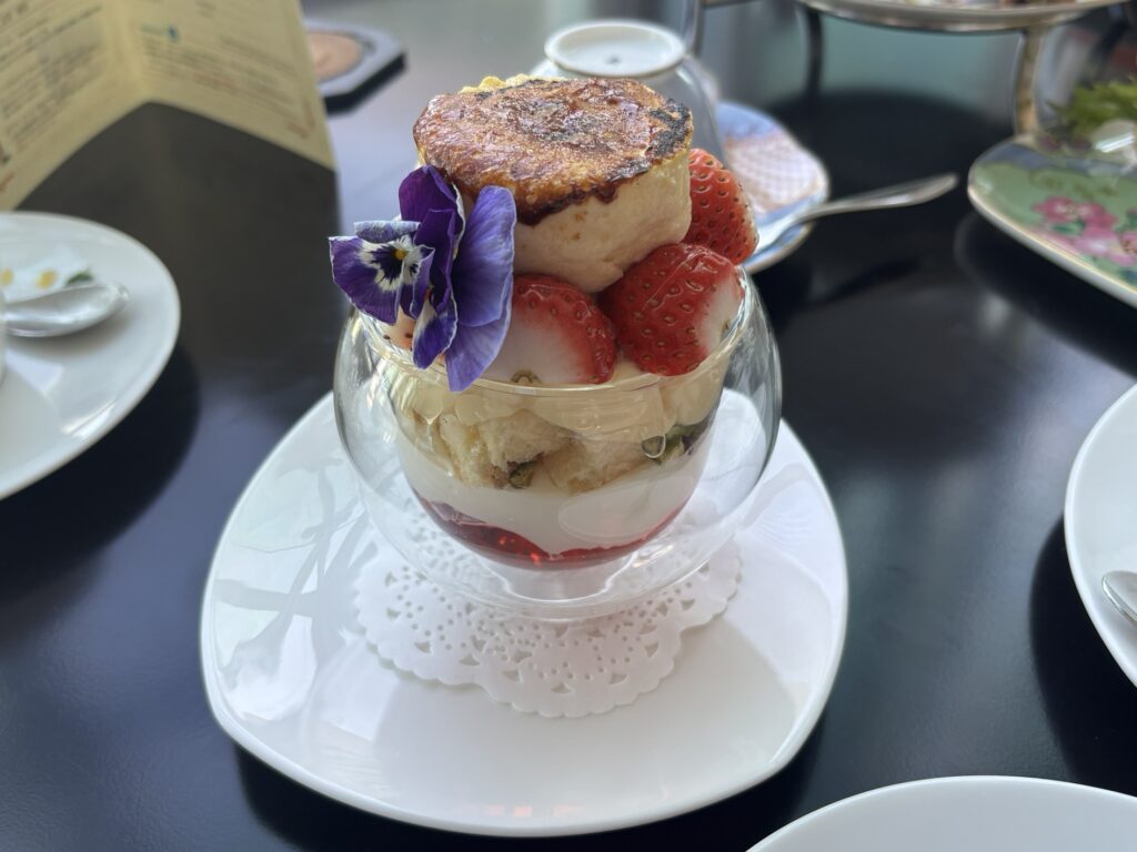 アフタヌーンティーの主役は、大きなシブーストとフレッシュないちごが乗った贅沢パフェ。🪽