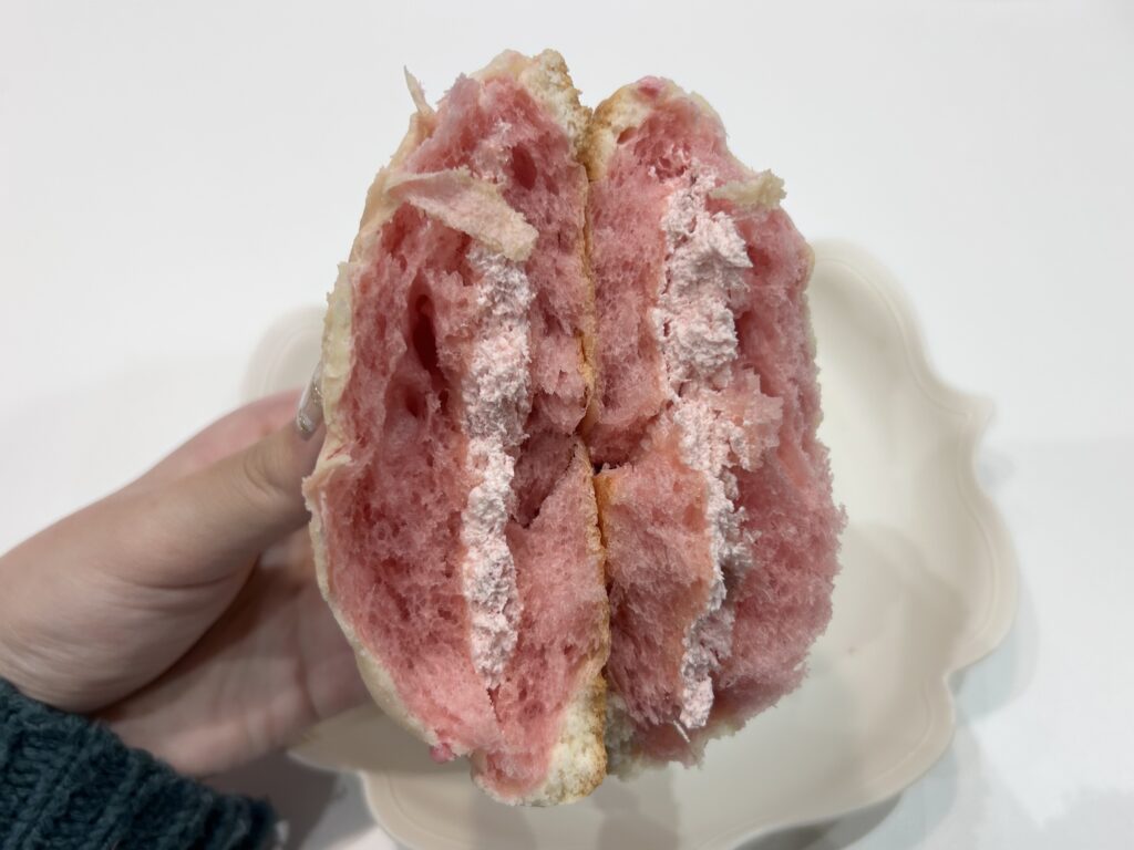 ピンク色のドーナツ生地に、いちご果肉入りミルクホイップをサンド。🍓✨