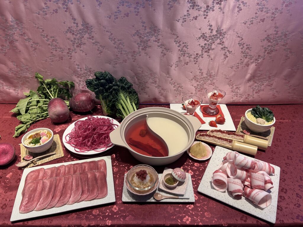 今回のフェアの主役は、紅の「梅たんしゃぶ」× 白の「鶏白湯しゃぶ」という、しゃぶしゃぶ温野菜では今年初の試みとなる紅白二彩の組み合わせ。🌸