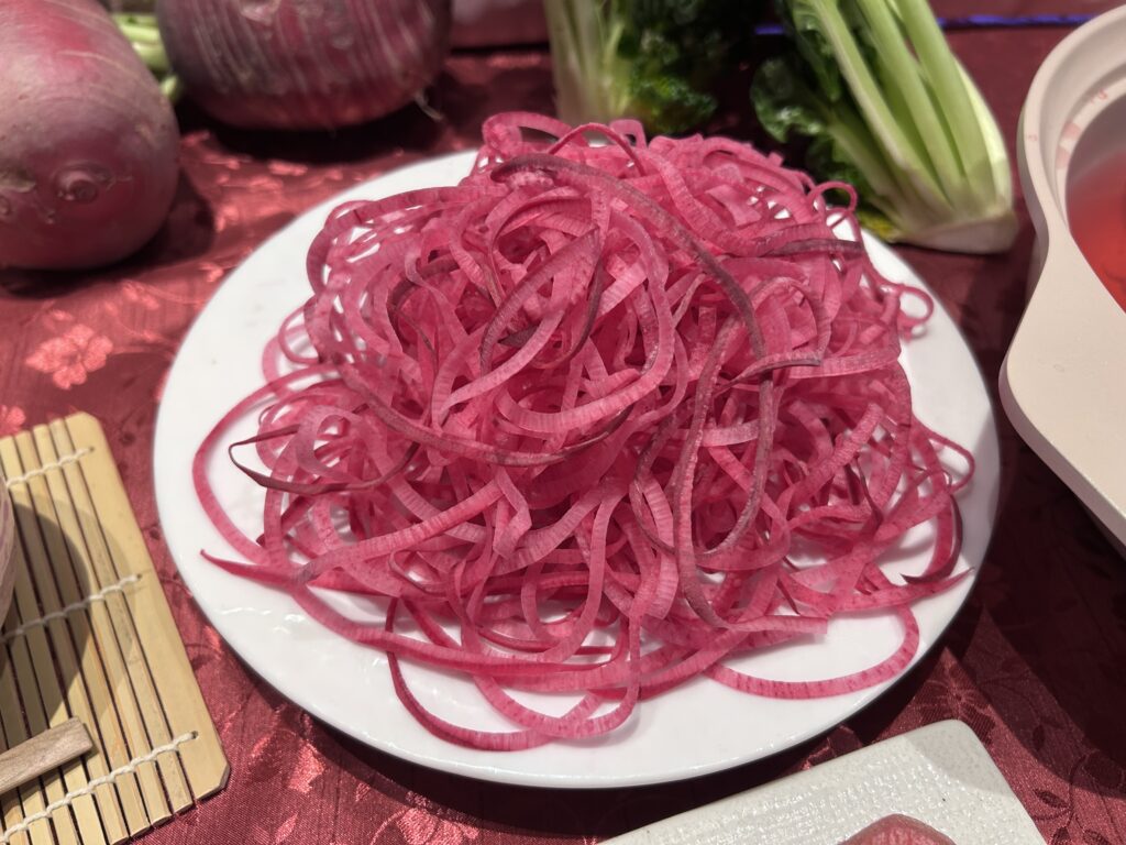 お鍋に入れると、おだしがほんのり淡いピンク色に染まり、紅白のグラデーションが完成するんです。💗