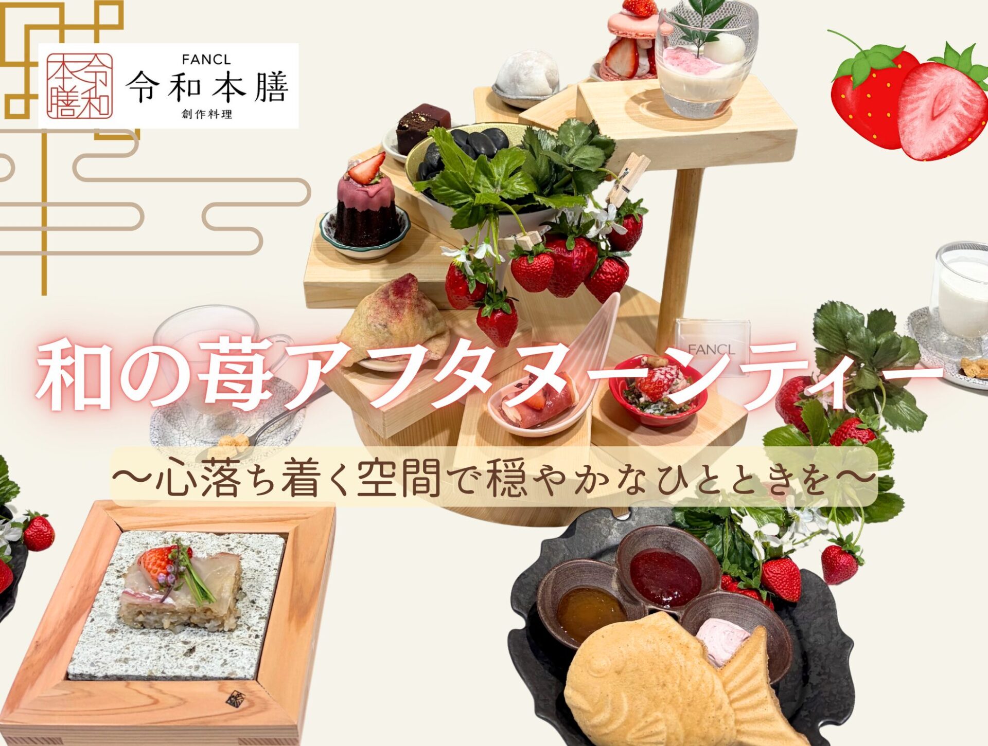 ファンケル銀座スクエア9階にある「創作料理 FANCL 令和本膳(東京銀座)」で、「和の苺アフタヌーンティー」が展開中!🍓