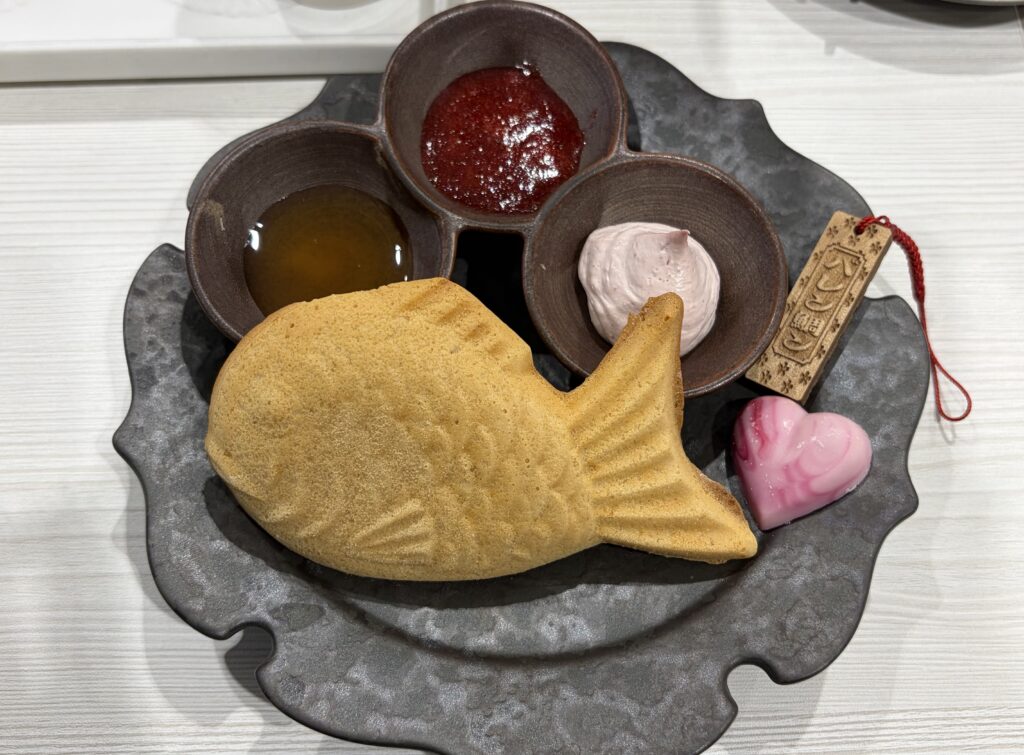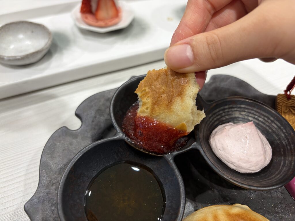 ⑤玄米粉のスコーンたい焼き(豆乳ホイップ、銀座はちみつ、苺ジャム)
