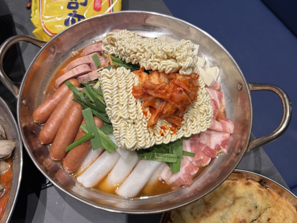 ソーセージ&スパム入りの韓国定番“辛旨鍋”。