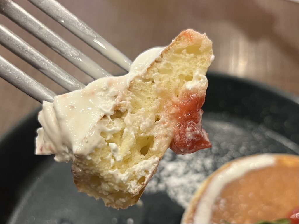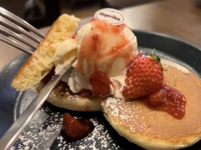 で構成されていて、ホットケーキのモチモチ食感とハーゲンダッツや苺の食感との違いを感じられる一品✨!
