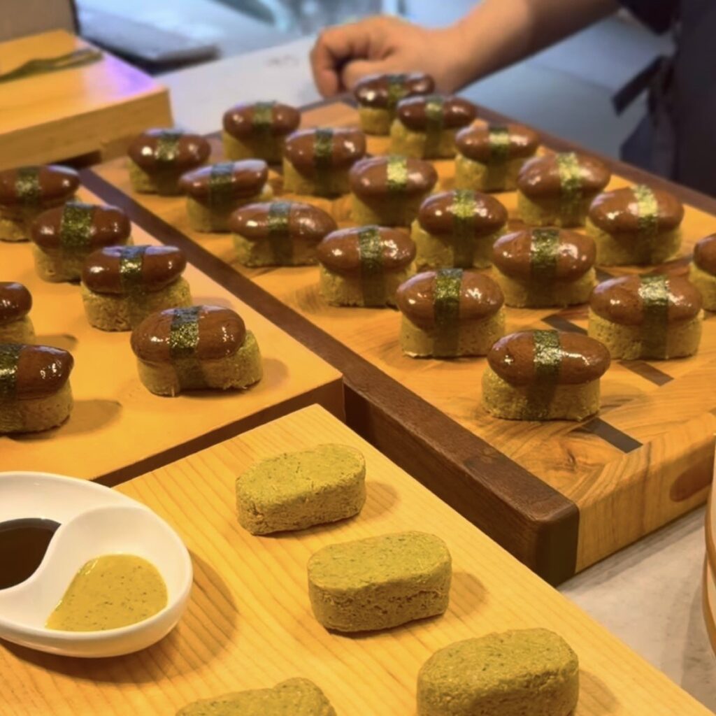 醤油に見立てたチョコソースと濃厚わさびに見立てたピスタチオソースにつけて楽しむことができるよ♪