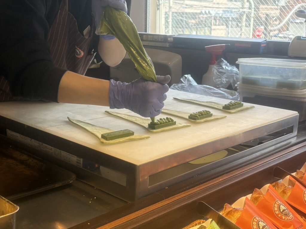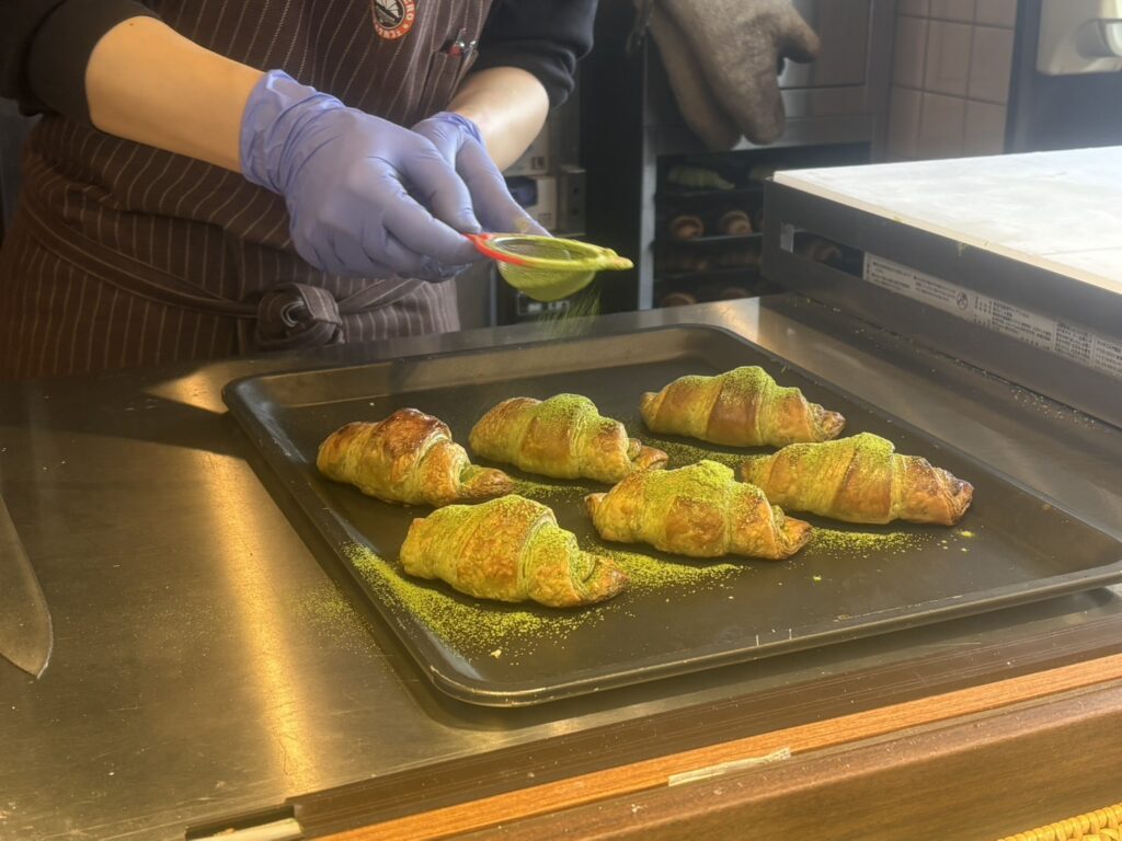 生地の上に抹茶チョコレートと抹茶クリームをのせて焼き上げた後、抹茶パウダーをふんだんにかけてできあがり🪄。