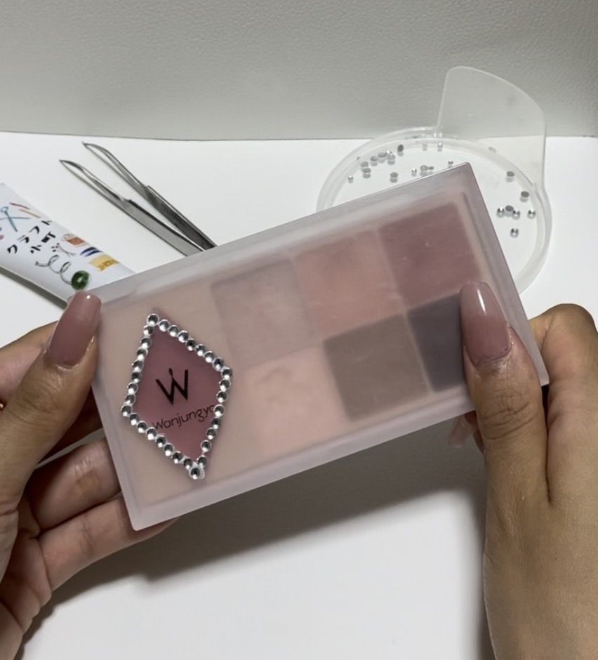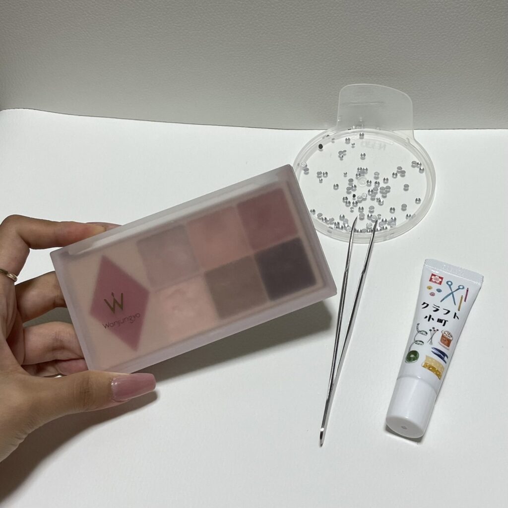 アイシャドウやパウダー、チークのケースにラインストーンデコをして自分だけの“キラキラコスメ”を作ろう🎀。