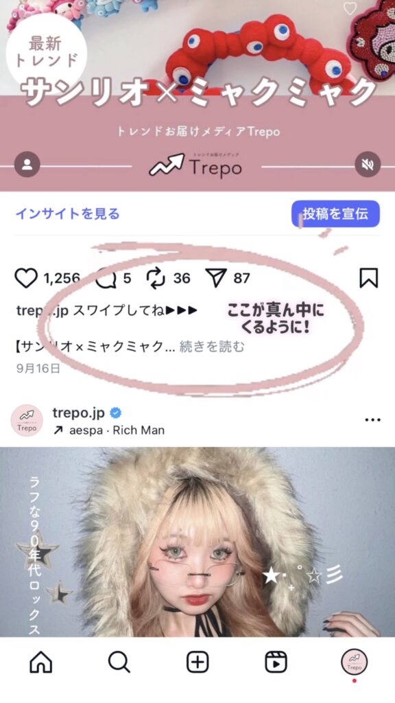 いいねやコメントの欄が真ん中に来るように、自分の投稿と投稿の間をスクショしてね!