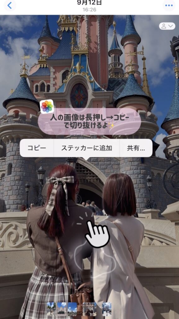 人の写真は、iPhoneの「写真」アプリで人の部分を長押しすると自動で切り抜いてくれるので、そのままコピー→Instagramにペーストしてね!