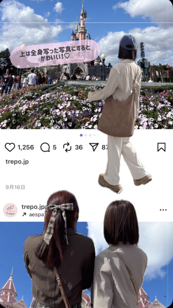全身のコーデを投稿したい時や、旅行の思い出を1枚にまとめたい時におすすめの「飛び出し加工」❤