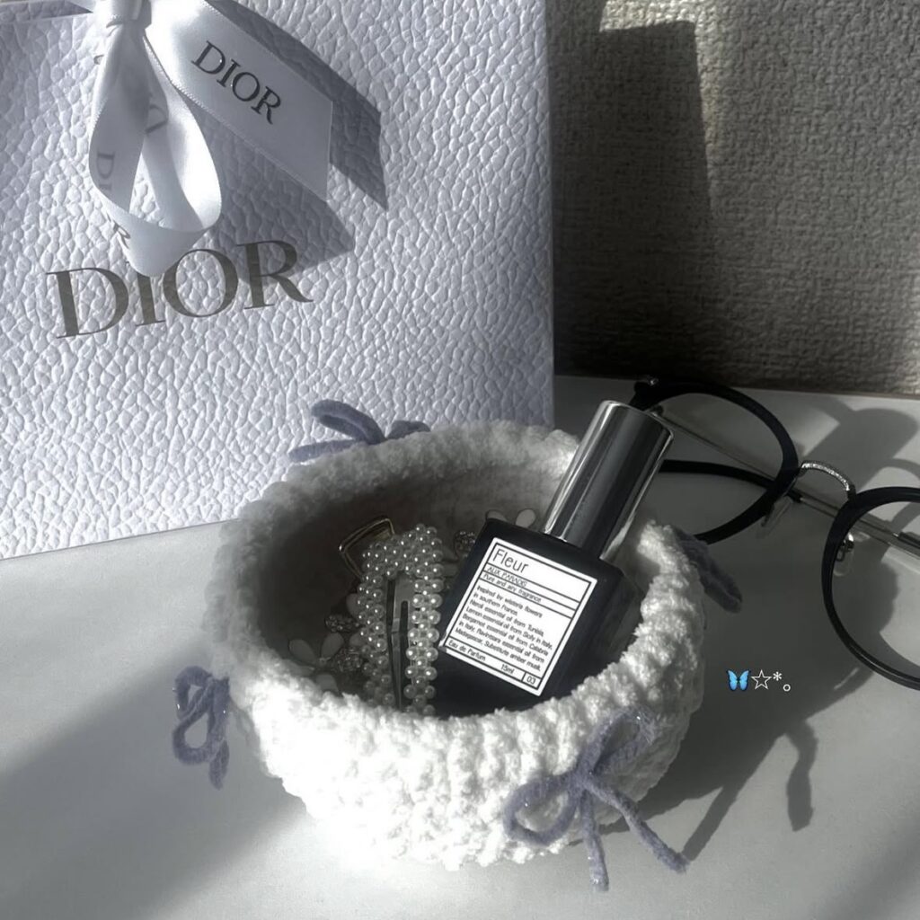 毛糸をリボン結びしてアクセントに付けると、簡単に可愛くなるよ🎀